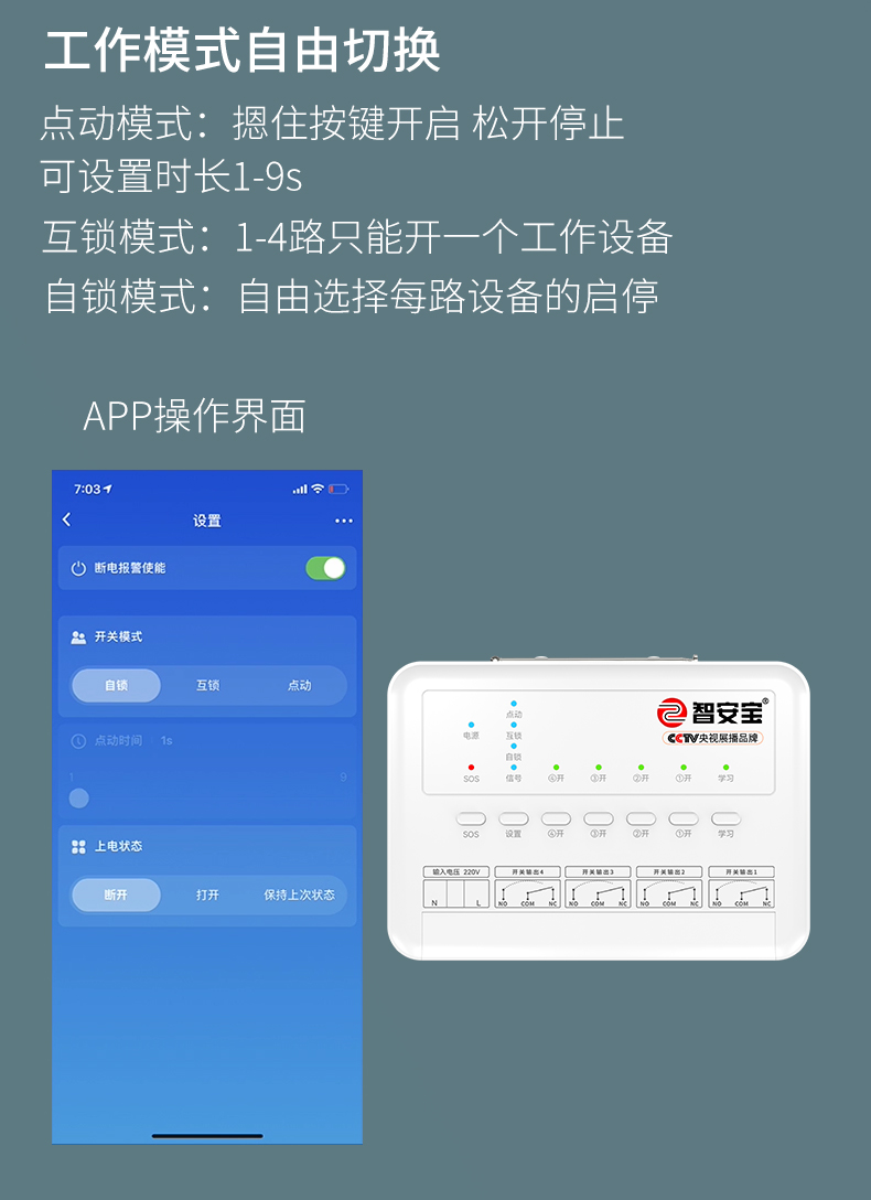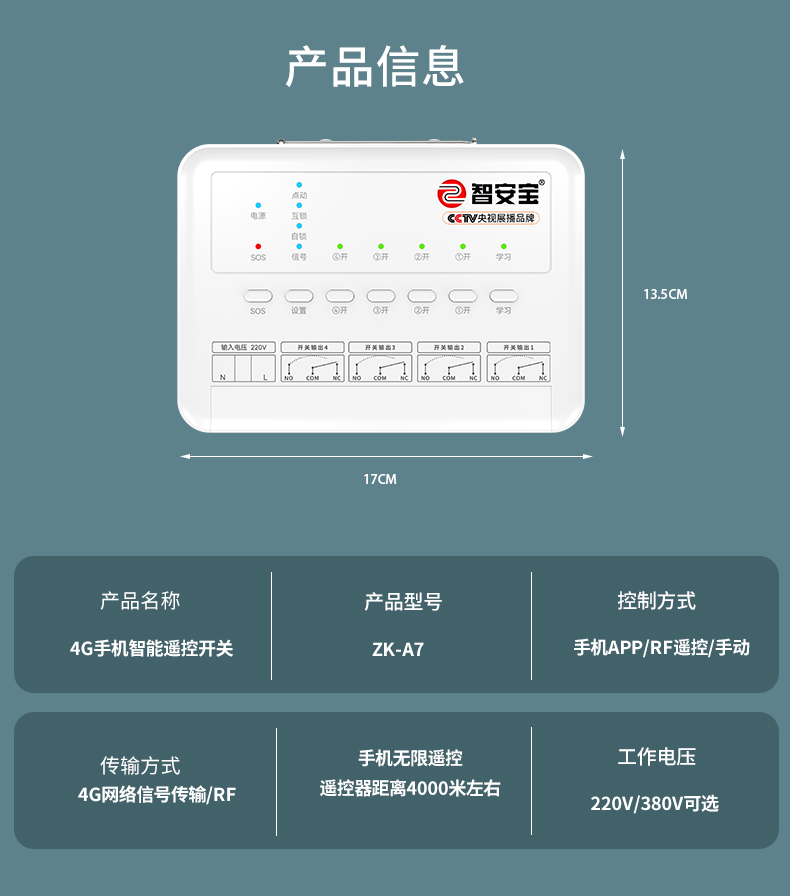 ZK-A7是一款四路智能遥控开关,手机APP远程遥控,不限距离,状态反馈,断电报警