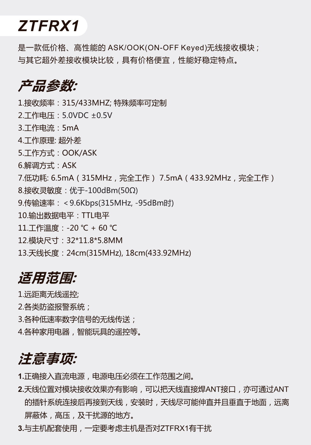 购买前要先确定频率。使用时接收频率、解码方式及振荡电阻应与发射匹配,否则无法使用!