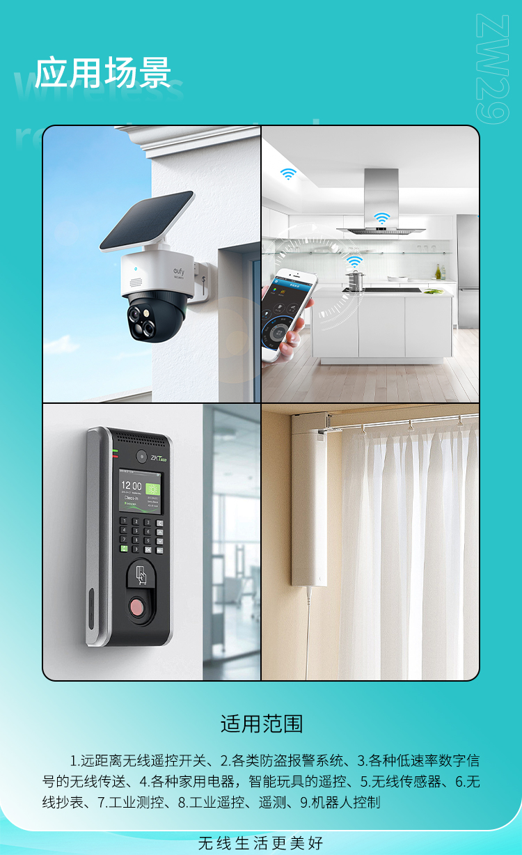 数据传输,黄瓜视频污污污遥控开关、遥控插座、道闸、遥控伸缩门、遥控电动门、遥控车库门、遥控卷闸门、平移门、遥控开门机、关门机等门控系统、遥控窗帘、报警器、遥控摩托车、遥控电动车、遥控玩具、防盗报警主机、汽车防盗产品、家庭防盗产品、遥控LED、遥控音响、安防等民用及工业配套遥控领域。