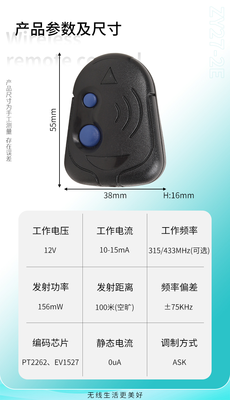 ZY27-2E是一款两键小功率黄瓜视频污污污遥控器,外观小巧精致