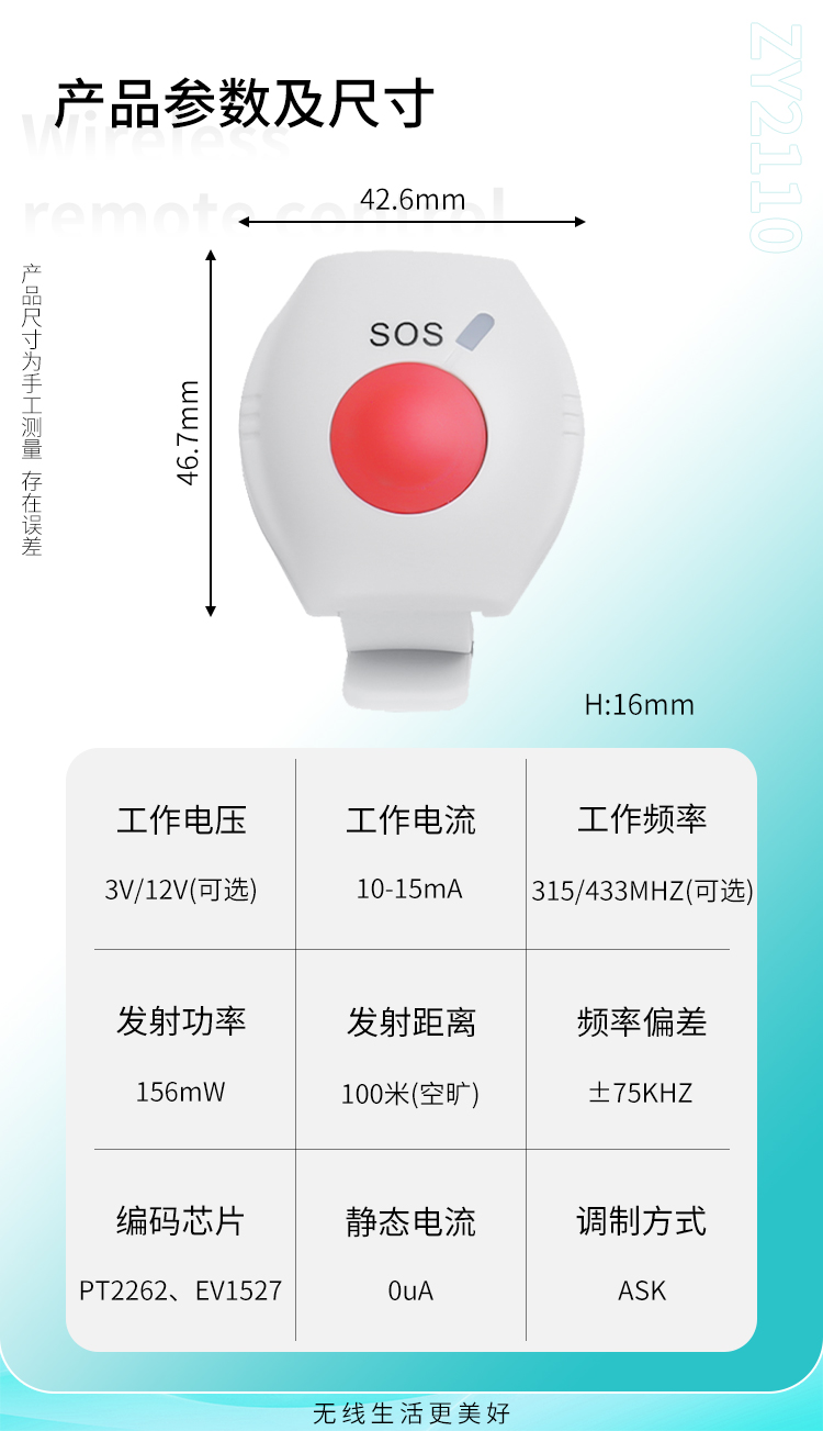 1、腕表式设计,携带和使用方便;2、按键延时触发,避免误报;3、功耗低,电池使用时间长。