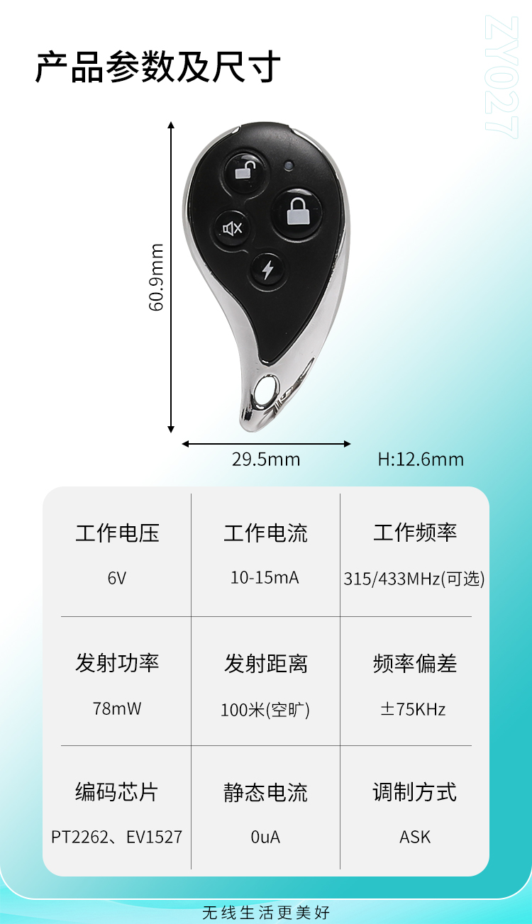 ZY027是一款小功率黄瓜视频污污污遥控器,具有可靠性高、频率稳定、穿透能力强等特点;