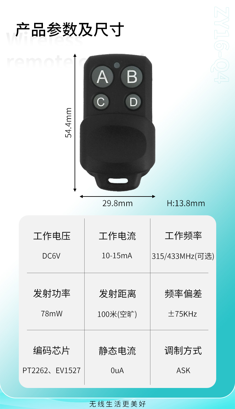 ZY16-Q4是一款小功率黄瓜视频污污污遥控器,具有可靠性高、频率稳定、穿透能力强等特点;
