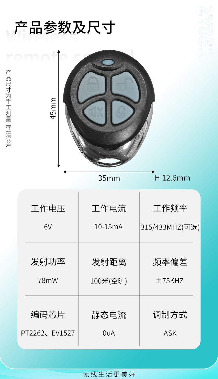 ZY051是一款小功率黄瓜视频污污污遥控器,金属边框,具有可靠性高、频率稳定、穿透能力强等特点;