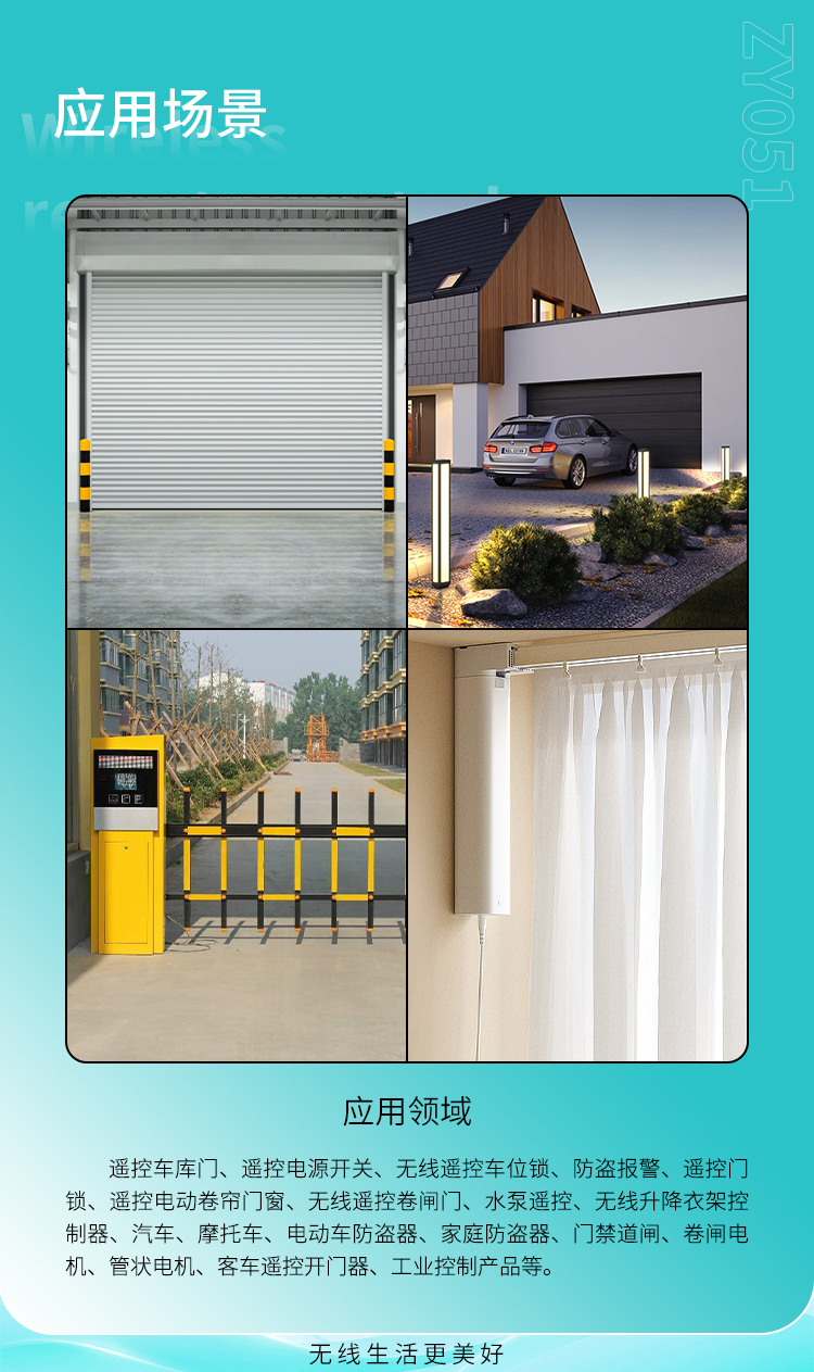 遥控车库门、遥控电源开关、黄瓜视频污污污遥控车位锁、遥控门锁、遥控点动卷帘门窗、节能灯光、家庭防盗系统、工业或家庭遥控控制等。