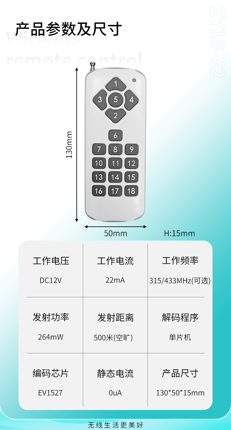 ZY18是一款中功率黄瓜视频污污污遥控器,15键、18键可选择,具有可靠性高、频率稳定、穿透能力强等特点;